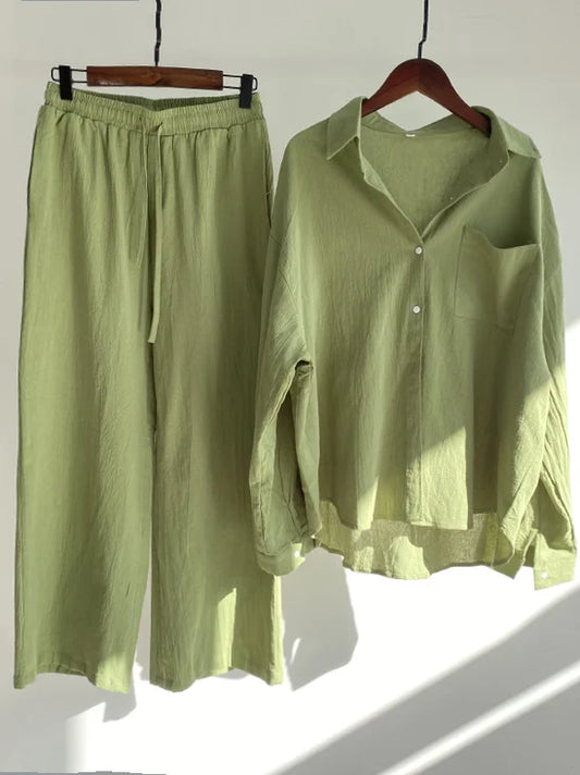 Felicitas | Damen Set aus Baumwoll-Leinen – Langarmbluse mit Hose